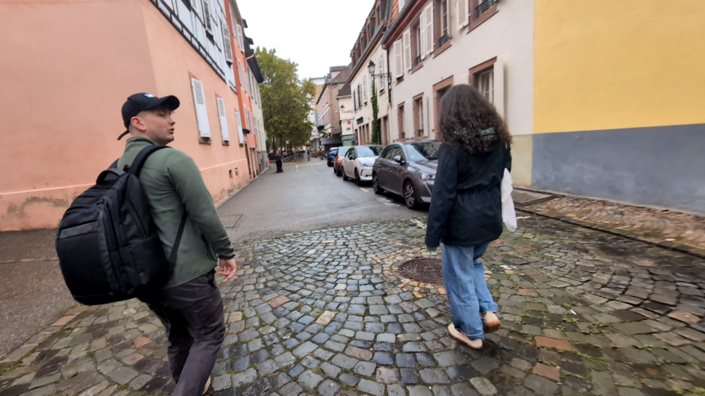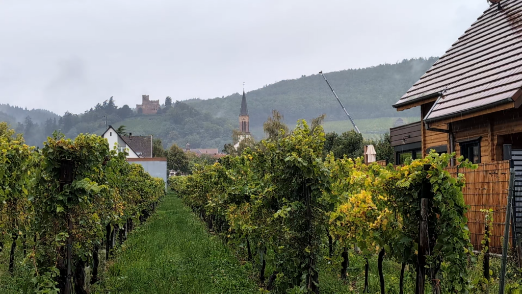 Ce n’est jamais très agréable de marcher sous l’eau et dans la boue, mais j’y allais avec le sourire. Je savais que j’allais être au chaud, au sec et que j’allais pouvoir manger une fois arrivé à destination. De plus, le paysage est magnifique : la brume se mêle aux sommets environnants et l’on peux apercevoir d’assez loin le château du Haut-Kœnigsbourg qui trône sur cette région viticole. Arrivé, je rencontre la famille d’Elodie, je lui expose mon projet d’aller jusqu’en Roumanie en autostop et elle décide de me suivre. Je resterai chez elle une semaine, ce qui m’a laissé le temps de visiter Châtenois en détail avec nos amis, nous sommes allés à Europapark et avons même fait avec Elodie un tronçon de la route du vin en stop ! Petit entraînement à deux avant la grande aventure vers l’Est de l’Europe.