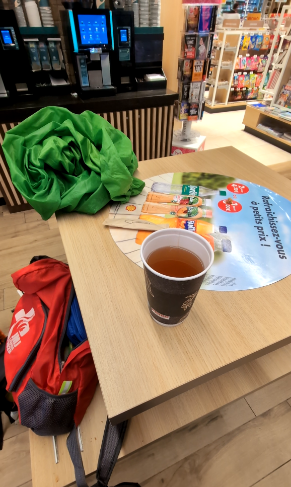 Mon premier objectif est de rejoindre Elodie, une amie d’Erasmus où j’allais passer quelques jours avec des amis que l’on a en commun. Je ne dors pas très bien car la veille, j’avais eu un passage en stop de nuit qui m’a fait arriver très tard. J’ai dû mettre ma tente sous la pluie et je me suis sans doute endormi à 2 heures du matin pour un réveil à … 7 heures. On ne peut pas trop attendre le matin pour ranger discrètement la tente. Une vendeuse à la station essence a été très gentille de me donner de l’eau chaude gratuitement ce qui m’a permit de commencer la journée avec un thé !