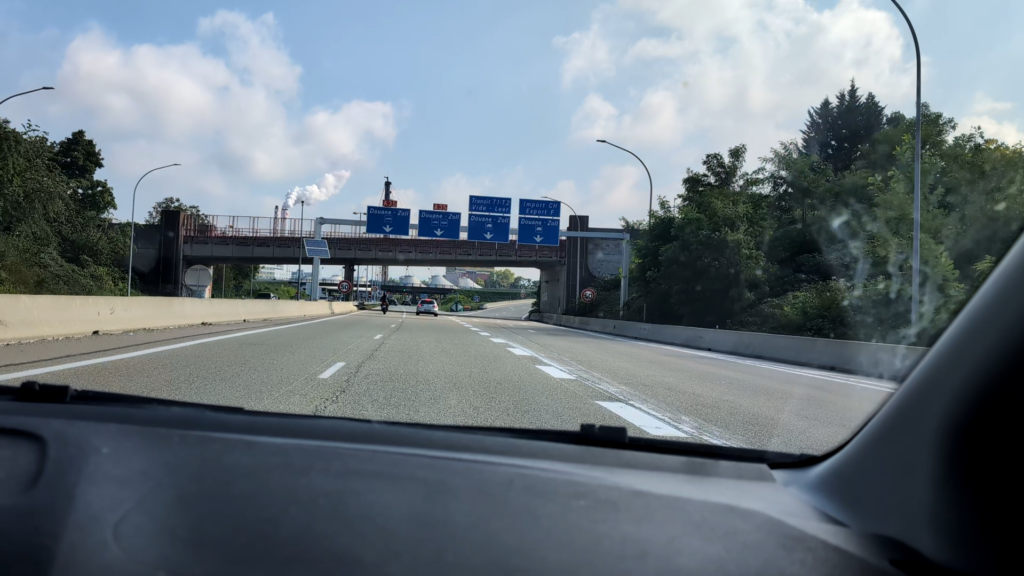 Pas beaucoup dormi de la nuit, mais le départ c’est aujourd’hui ! Marie-Claire, la mère d’Élodie, nous transporte tous deux à la station du Haut-Kœnigsbourg où nous allons enfin commencer cette longue aventure vers la Roumanie et la Mer Noire. Plusieurs voitures et camping-cars étrangers, c’est bon signe pour s’éloigner rapidement vers l’uns des pays frontaliers. On s’est dit que nous allions passer vers la Suisse car c’était vraisemblablement le chemin le plus court vers notre destination. Au bout de 20 minutes, nous tombons sur Stéphanie, une mère de famille aux cheveux blonds qui se rendait après Mulhouse, première grande ville frontalière avant la Suisse ! Elle était forte sympathique, mais nous nous rendons compte rapidement qu’il n’y a aucun endroit où elle peut nous déposer avant Mulhouse. Première erreur de ne pas avoir regardé les stations essences en avance ! Nous descendons donc à l’Ouest de la ville et dans le mauvais sens, qui pointe vers la France et non vers la Suisse.