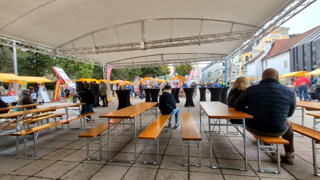 Elles étaient très sympathiques et nous ont déposés en plein centre de Linz. On arrive sous un ciel très nuageux avec un peu de pluie et surtout un grand froid ! La ville est pourtant magnifique et le ciel s’éclairci dans l’après-midi. On arrive en même temps qu’un festival paroissial pour la planète : tentes, musiques, activités, stands de nourriture. Je dois dire qu’on s’y plaît très bien !